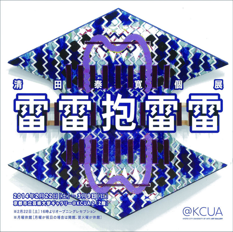 清田は、言葉が図像に直結するような絵画表現を目指し、表現形式には半立体を選んできた。本展で出品されたのは、キャンバス布を材木で組まれた立体的なフォルムに張り込んだシリーズであり、絵画 作品の支持体であるキャンバス布が清田の考える言葉やイメージのルールに従って独特な曲面を描きな がら新たなフォルムを形成している。