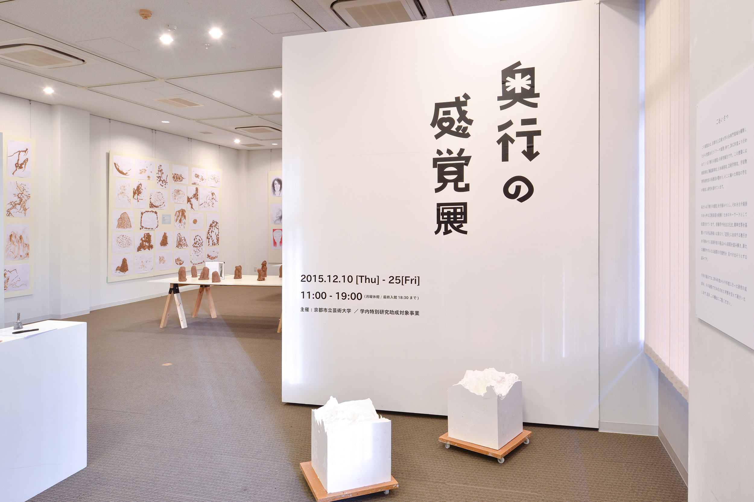 京都市立芸術大学の各専門領域を横断しながら授業を行う「テーマ演習」の一つとして2012年度より行われている「奥行きの感覚」では、彫刻専攻、陶磁器専攻、日本画専攻、芸術学専攻、宇宙物理学研究室の各教員と様々な専攻の学生が参加して、「奥行きの感覚」を古今東西のあらゆる芸術表現を紐解くためのキーワードとして研究を進めている。図像学や社会文化史、精神史等を基盤とする作品評価とは異なり、「造形」に由来する奥行きを手掛かりに実制作者の視点から表現を読み解き、新たな解釈やさらなる展開の可能性を見つけ出そうとする試みである。今回の展示では、2014年度から今年度に行った研究の成果を、その過程で生み出された考察を交えて紹介した。