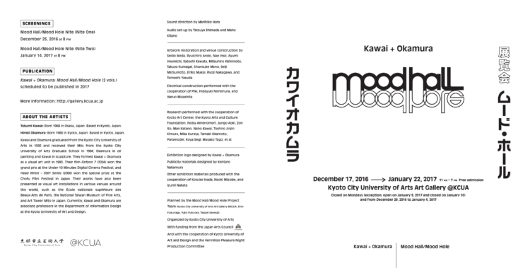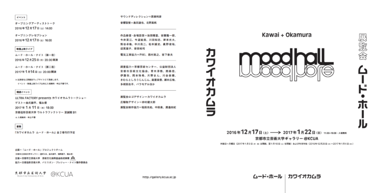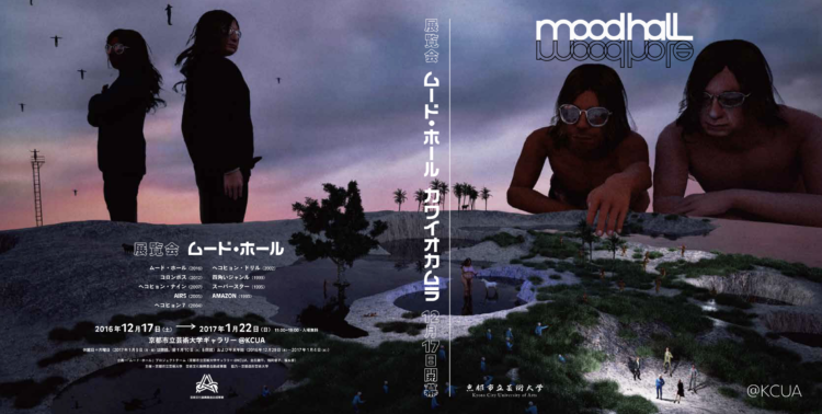 京都市立芸術大学大学院卒業生の川合匠と岡村寬生による映像ユニット、カワイオカムラの9年ぶりの個展。カワイオカムラは1993年に結成され、彫刻と絵画が合体した巨大なライトボックス作品などを制作していたが、徐々にその絵画的、造形的要素は映像の中へと展開した。現在は主にデジタル・モデルアニメーションを中心に、各国の国際映画祭での出品・受賞など世界的に活動している。本展は「mood hall」とも「mood hole」とも聞き取れるキーワードをタイトルに、堀川御池ギャラリーの全室や共有スペースを含む全館を使って開催された。新作《ムード・ホール》プロジェクトの発表、前述のライトボックス作品の修復展示や最初期の映像作品の数々の再展示、第35回アルスエレクトロニカ・フェスティバルで栄誉賞を受賞した映像作品《コロンボス》の日本初上映など、カワイオカムラ史上最大規模の個展となった。