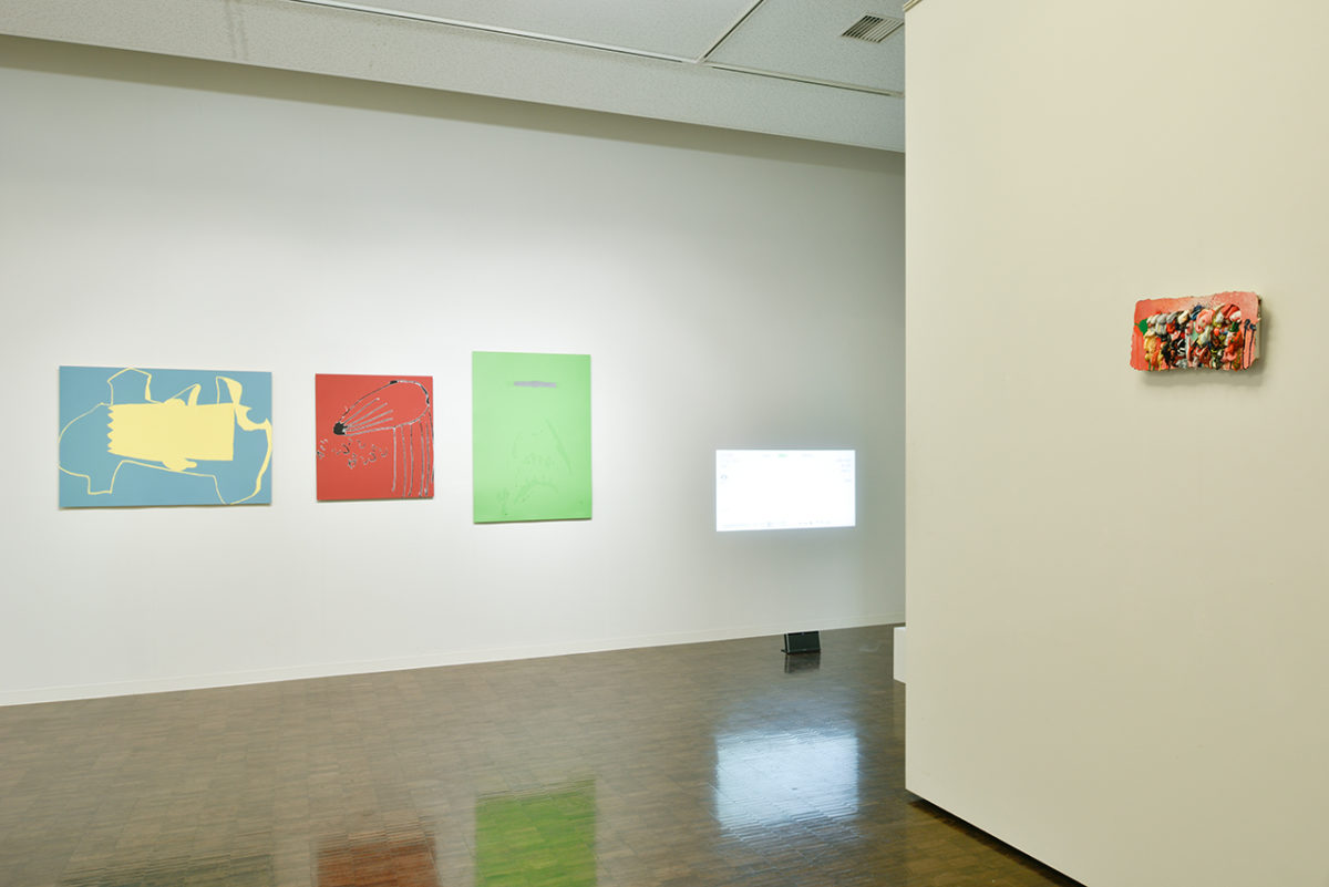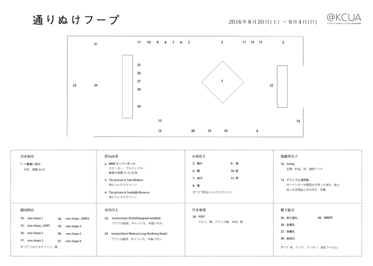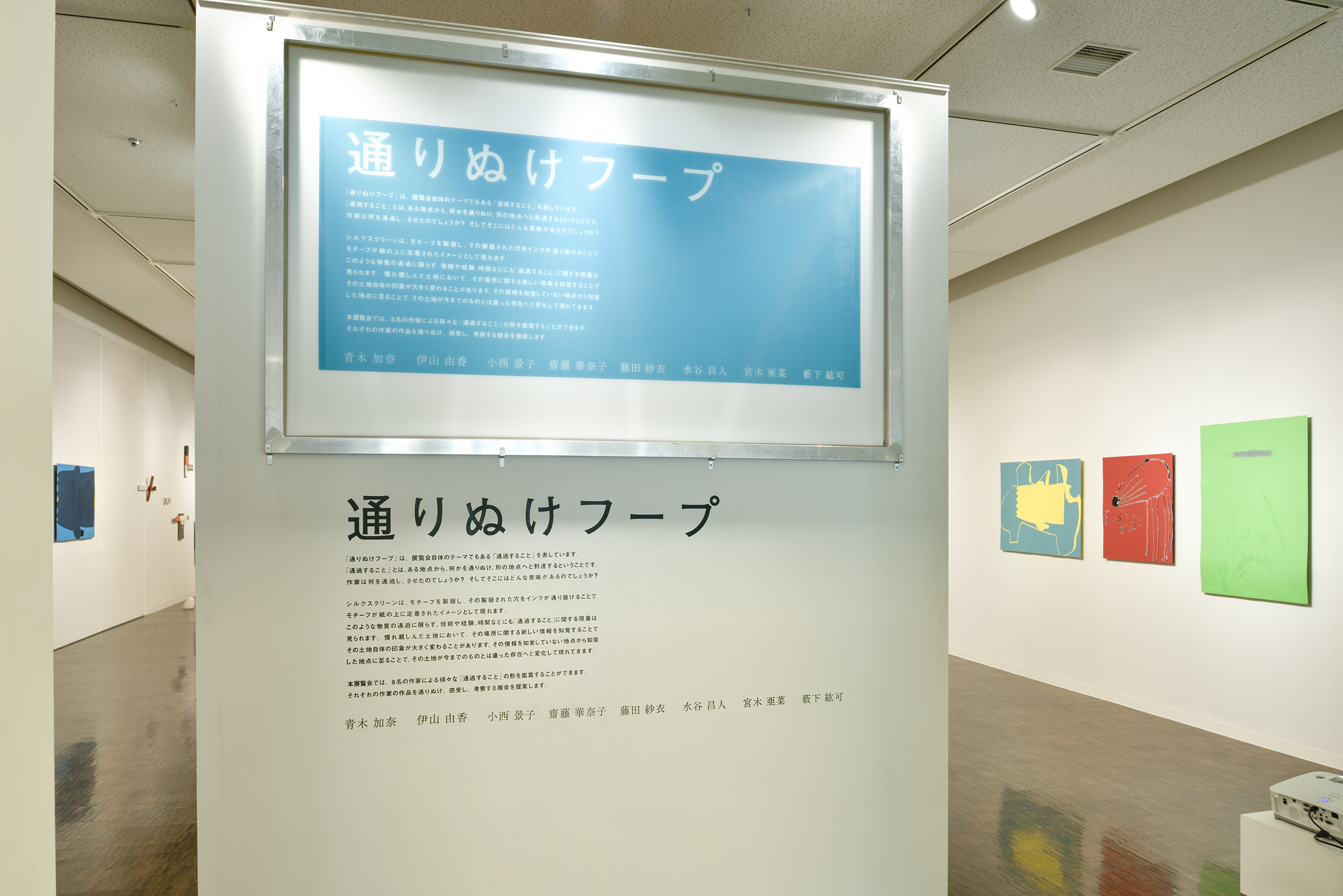 本展のタイトル「通りぬけフープ」は、そのテーマである「通過すること」を表している。孔版画であるシルクスクリーンでは、製版された版をインクが通りぬけることで、モチーフが支持体の上に定着しイメージとして現れる。こうした物質に限らず、情報や経験、時間なども通過するものと捉え、8名の作家がそれぞれのアプローチによって制作した合計29点の作品を発表した。これは、展覧会場を一つの通過地点として、作家と、鑑賞者の双方の立場からこのテーマを考察するための問いかけであったといえよう。