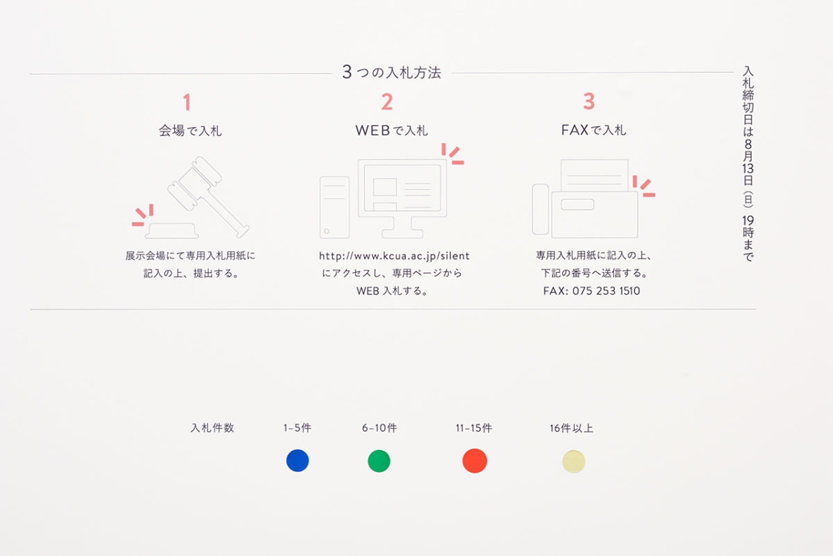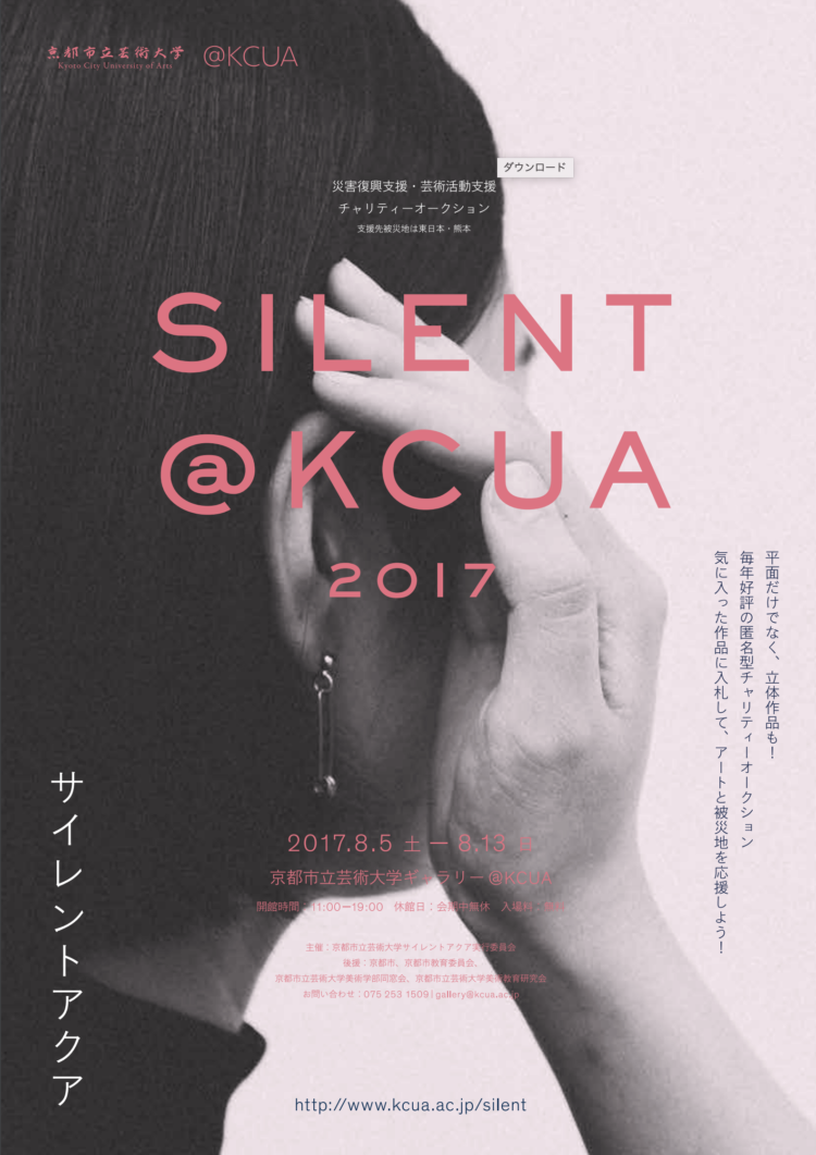 チャリティーオークション「SILENT @KCUA(サイレントアクア)」は、東日本大震災をはじめとした災害の復興に関わる活動をしている団体等を広く支援することを目的として、2011年より実施している。入札方法にサイレントオークションを採用し、さらに作家名を伏せて作品を展示するという形式をとっている。本学の学部生、院生、留学生、教員(非常勤含む)、旧教員、卒業生、修了生など本学ゆかりの作家166名から335点が集まった。収益の7割を被災地にて芸術を通したボランティア活動、支援活動を行っている団体への活動資金として、また3割を京都市立芸術大学に在籍する学生の芸術活動の支援金(留学支援・奨学金)として寄付を行った。なお、2018年11月22日のサイレントアクア実行委員会にて、本事業は2017年度をもって終了することが決議された。