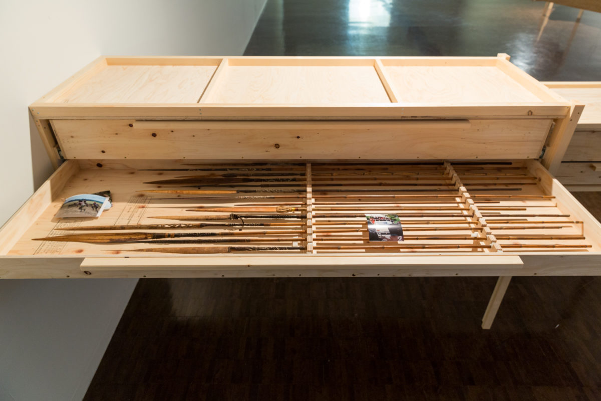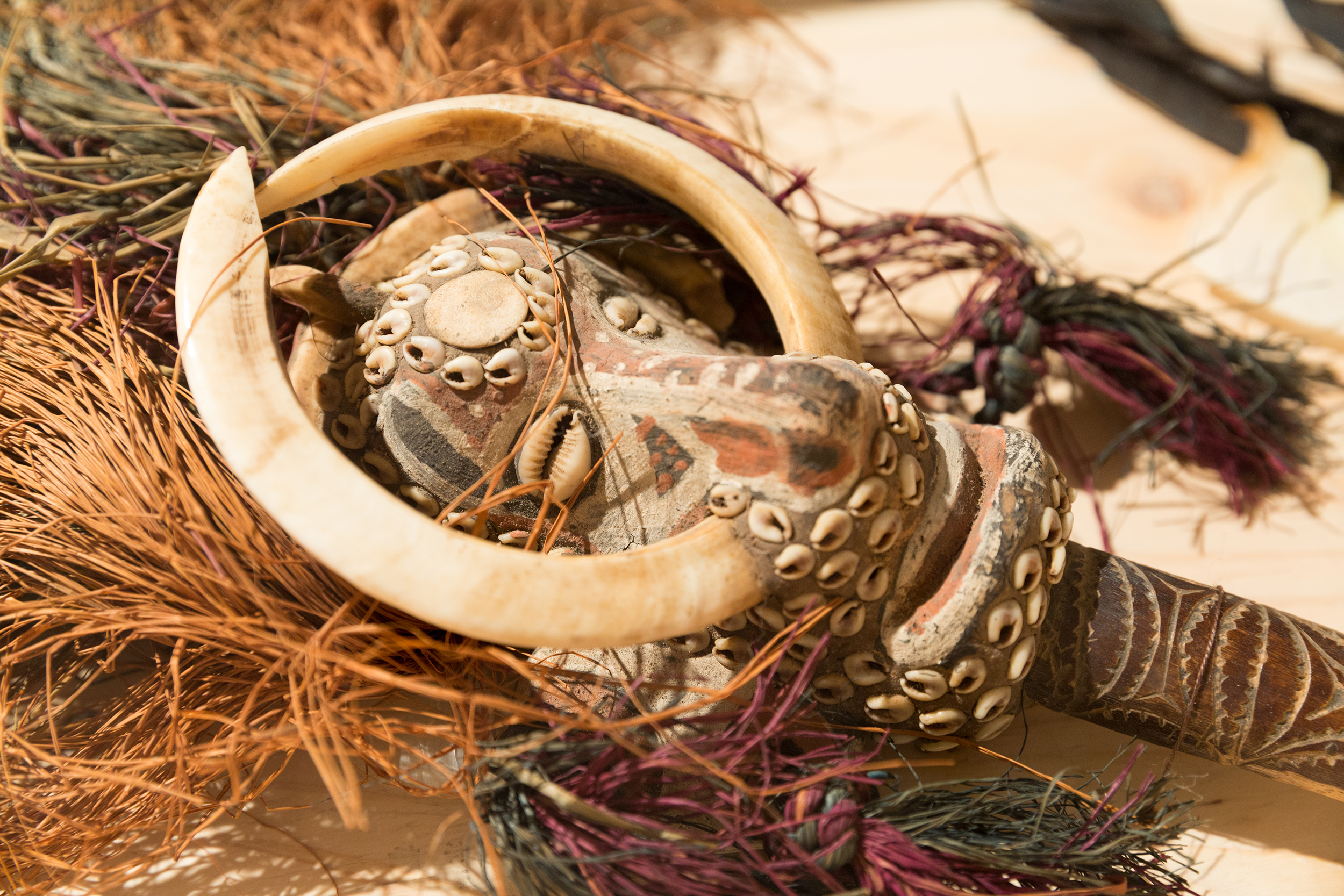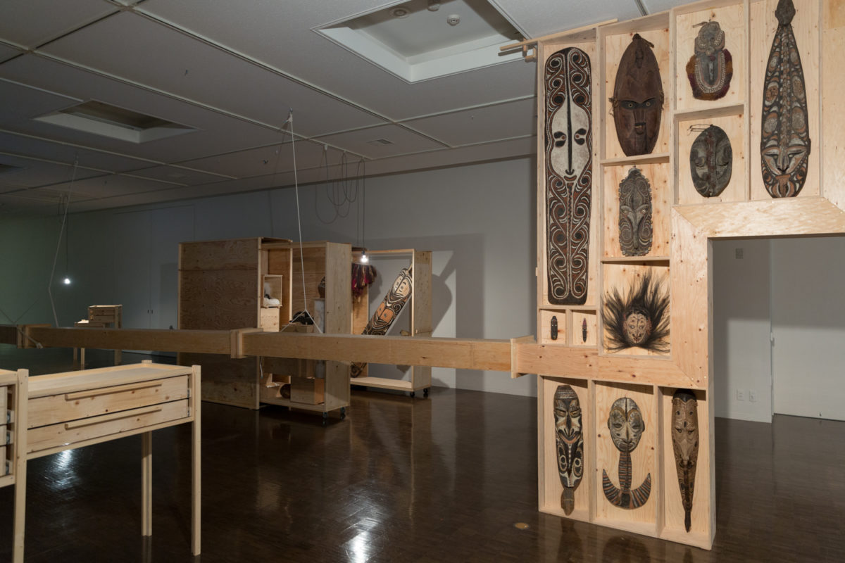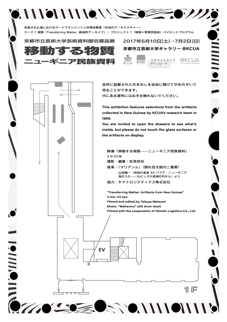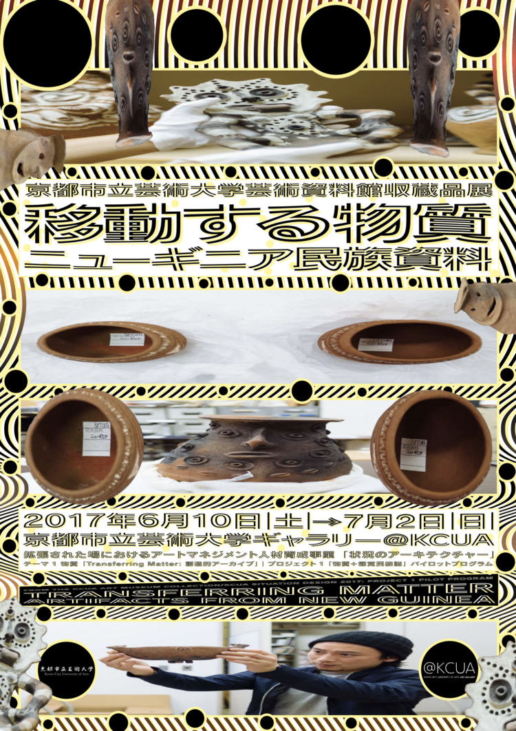 京都市立芸術大学芸術資料館では、学生の卒業作品や美術工芸に関する参考品など、本学の教育活動を背景とした資料を収集している。本展では、その中の特殊なコレクションの一つ、昭和44年(1969年)に美術調査隊によって収集されたニューギニア民族資料を取り上げ、その物質的側面に焦点を当てた展示を行うとともに、移動によって切り離されてしまった、かつてそれらがあった場所に満ちていた非物質的なものを、展示された物質と再び融合させることを試みた。また、研究者たちの協力を得て、音や映像などの非物質的であるが移動可能な資料を用いたレクチャーシリーズを会期中に行い、展示室内の収蔵品の本来の文脈を探った。