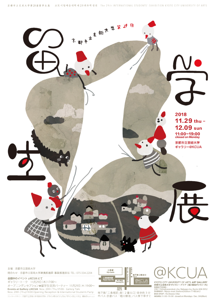 京都市立芸術大学に在籍する留学生と市民との交流機会として、毎年冬に開催される本展では、修士課程の本科留学生、研究留学生、交換留学生(本年度はイギリス、イタリア、韓国、コンゴ、スペイン、台湾、中国、フランスから37名が出品)による作品が展示された。