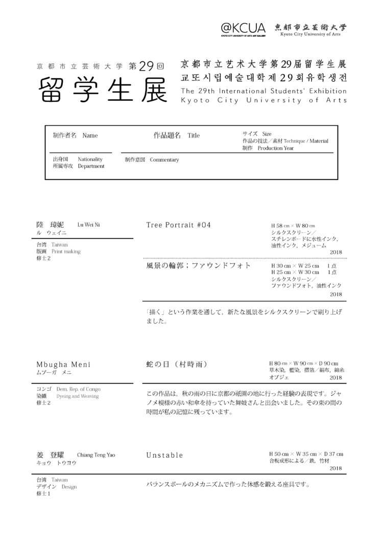 京都市立芸術大学に在籍する留学生と市民との交流機会として、毎年冬に開催される本展では、修士課程の本科留学生、研究留学生、交換留学生(本年度はイギリス、イタリア、韓国、コンゴ、スペイン、台湾、中国、フランスから37名が出品)による作品が展示された。
