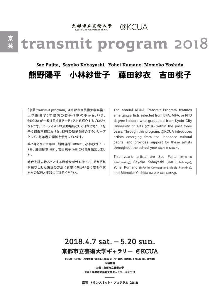 「京芸 transmit program」は、アーティストの活動場所として日本でも1、2を争う都市京都における期待の新星を紹介するシリーズとして、京都市立芸術大学卒業・大学院修了3年以内の若手作家の中から、いま、@KCUAが一番注目するアーティストを紹介するプロジェクトである。第2弾となる本年は、熊野陽平(構想設計)、小林紗世子(日本画)、藤田紗衣(版画)、吉田桃子(油画)の4名を選出した。