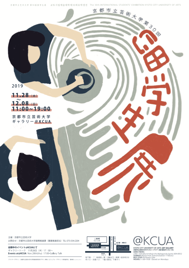 京都市立芸術大学に在学する留学生と市民との交流機会として、毎年冬に開催される本展では、修士課程の本科留学生、研究留学生、交換留学生による作品が展示された。