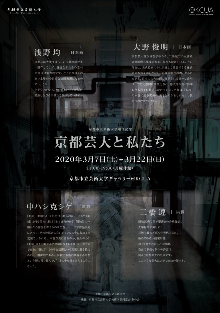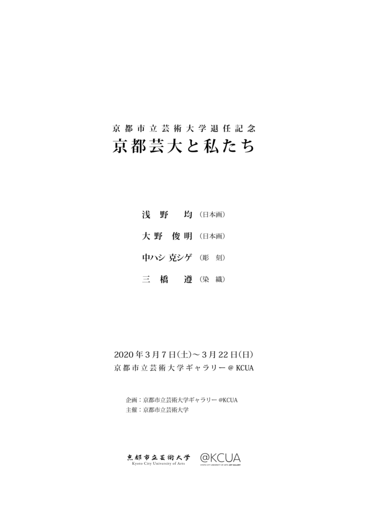 本学美術学部教授の浅野均(専門:日本画)、大野俊明(専門:日本画)、中ハシ克シゲ(専門:彫刻)、三橋遵(専門:染織)の退任記念展。@KCUA 1では「大学と私」というテーマに沿って同4人によるグループ展形式で、@KCUA 2および堀川御池ギャラリーの展示室A、B、Cの4室ではそれぞれ個展形式での展示が行われた。