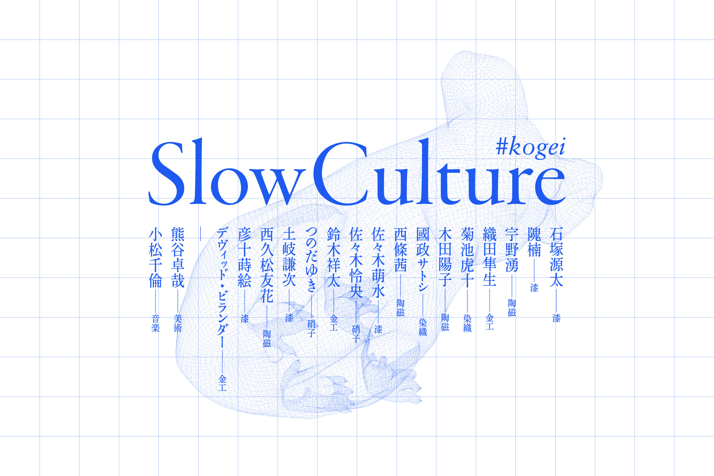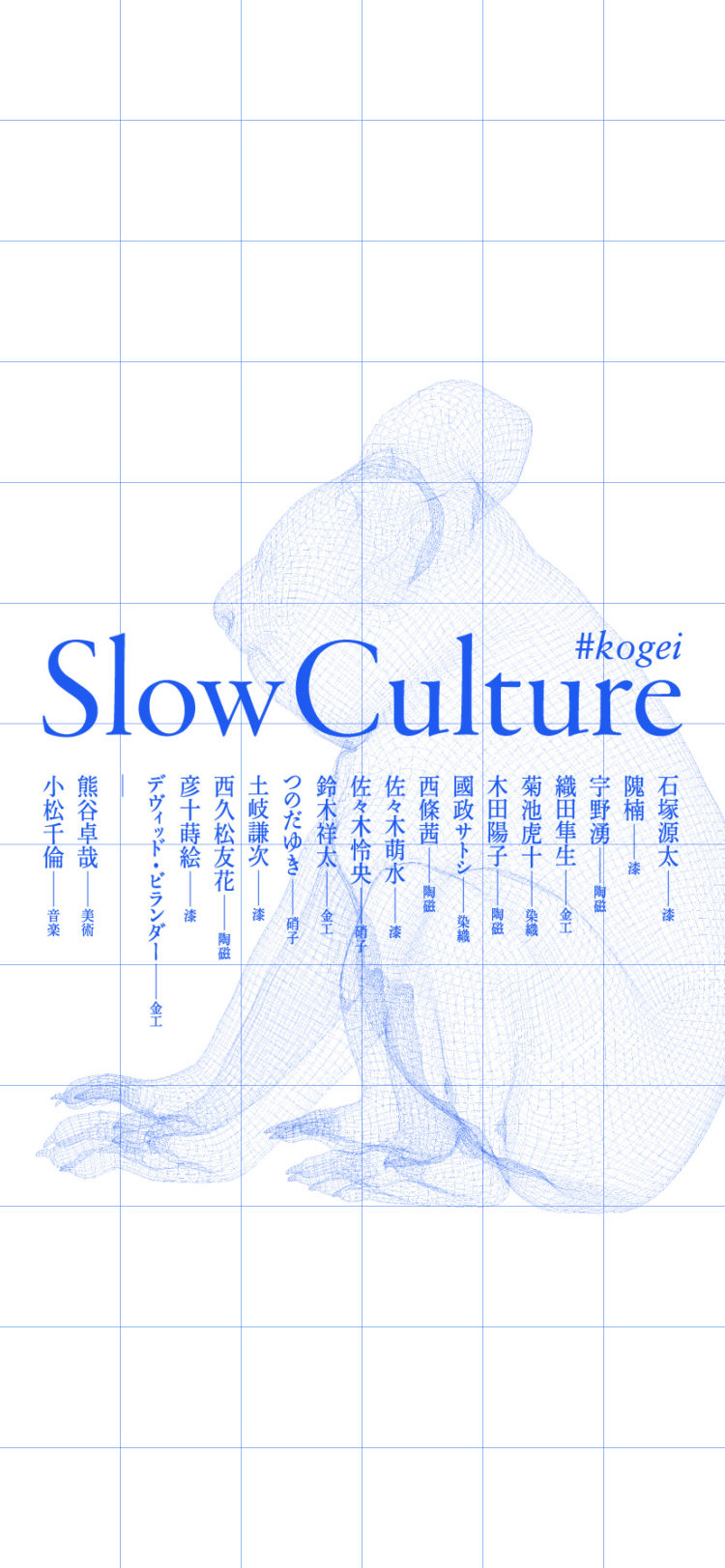 本展「Slow Culture #kogei」では漆・陶磁・染織・ガラス・金工などの工芸あるいは工芸的要素を取り入れる16名(組)の作家を取り上げ、現代の思考や感覚、新しい素材や技術、そして伝統を融合させた表現を紹介するとともに、自然環境や社会の問題に他ジャンルの専門家と連携して向き合う今日的な工芸観にも注目します。展示空間はデジタルの概念を引用して独自の彫刻観を探求する美術家の熊谷卓哉との協働により設計。会場に流れるサウンドを、美術と音楽をまたいで多才に活動する小松千倫が演出します。デジタルテクノロジーの加速度的な進化により、リアルとバーチャルが融け合う社会の状況を着想源とした「現代を表象する場」を設え、モノと場の調和や対比を生み出す実験的な空間に作品を展示します。