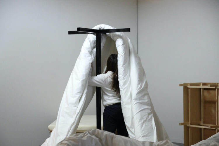 宮木:行為の痕跡として展示しています。パフォーマンスによって生じたベッドのわずかな窪みや、枕元に落ちている髪の毛1本を手がかりに、そこにはいない人の気配を想像することができます。装置のレイアウトはパフォーマンスの時々に、行為に集中するための配置へと変化します。目を閉じた状態で感じる周りの光量や色、目を開いた時に映る情報、布団の肌触りなどに気を配りながら、心地の良いものと悪いものを取り入れて配置を決めます。装置を見ることから作品全体を想像してもらうのも良いし、造形的に構成されたものなのかなとか、自由に見てもらえたら嬉しいです。「どう見たら良いか」と尋ねられることがありますが、こちらが感じていることと、見る人が感じることがぴったり合わさってはいけないとも思っています。むしろ色々な見方へ広く展開できる方法について考えています。鑑賞者の個人のことに少しでも紐づくことがあればと思います。