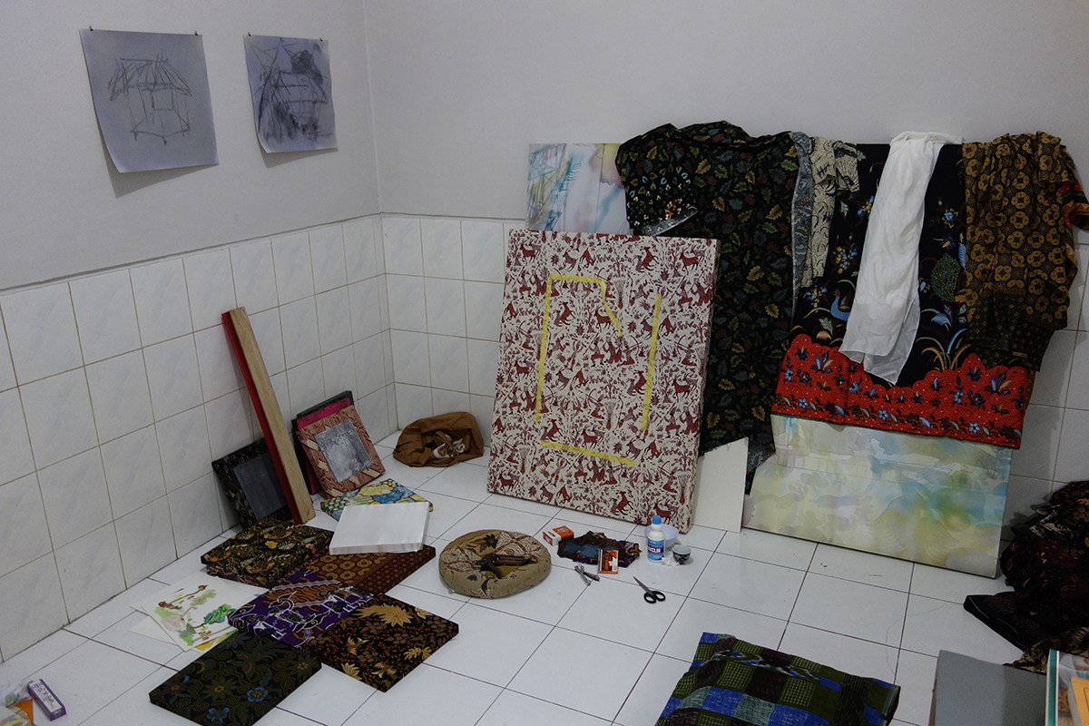 インドネシアから見たヨーロッパやオランダということだけでなく、そこにある接ぎ木的な表現だとか、アジアの絵画、自分の絵画はどうやって作られるのかということを考えたかったんですね。オランダは長年インドネシアを植民地にしてきたし、戦時中は日本がインドネシアを占領しているなど、不可避的に接ぎ木的な記憶につながっている。それに、インドネシアの染色品は日本の着物にも使われていたりするし、縞の織物とかにはインドネシアからの影響もあると思うんですよね。自分はもともと染色文化に興味を持っていましたし、イスラム文化にも関心がありました。あと、インドネシアのジョグジャカルタは京都府と姉妹都市なんですが、中心に王宮があって、その周りにたくさんの大学や学生街があり、20歳前後の人が流動的に入ってきていて常に何か行われているような活発な状況で、アーティストもいっぱいいるのが面白そうだなと思いました。伝統もありつつ、コンテンポラリーでもある、というところが。そして、ポーラ美術振興財団への助成申請が運良く採択され、2014年の初夏からインドネシアに行くことになったんです。