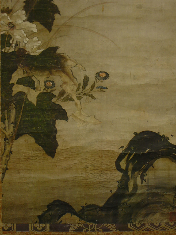 博士論文は「変質の絵画」というタイトルで書きました。フェノロサや岡倉天心の時代からの美術を取り巻く状況の変化や、西洋美術史においてのバロックの特徴などを学びつつ、自分が使っていた色彩をネガポジ反転させるとか、オークションカタログに写っている焼き物の表面の絵を描いたりとか、いかにして変質を肯定的に捉えるかということを考えてきました。日本絵画により関心が強くなったのは、2004年か2005年頃にYahoo!オークションで掛け軸を買ってからですね。入札者がいなければ1000円とかで買えたんです。偽物だけど。それが面白くて、ひたすらチェックしていました。例えば伝宗達とか出てくるんですよ。めちゃくちゃ安く。いやいやありえないからって(笑)。でも絵として面白いならいいやと思って買って、その名もなき画家の古い絵を制作室の壁に掛けて、いま自分が描いているものと比較していました。また、京都の新門前、古門前の骨董屋さんで掛け軸を見せてもらったりもしました。そういうところから、日本の絵画の文脈と現在の自分の制作を地続きに考えるようになっていました。自分がやっていることには、すごく工芸的な部分があるんですよね。サテン布に染料を使って、しかも焼き物をモチーフにしているとか、その手触り、触覚的なことが好きとか。そもそもの関心が絵画そのものというよりももう少し広くて、文化交流史というのか、文物の背景に強い関心があって、そういうことを表現の中に取り込みながら絵画のようなものを作ってきたという認識です。