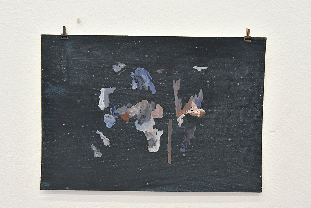 2018年くらいからインディゴのペーストを使うようになりました。最初は今のような形ではなく、絵具に混ぜたりして使っていました。インディゴはインドネシアのローカルな農作物でもありつつ、植民地時代の強制栽培作物として輸出されていたという歴史もあります。藍は世界中にあるので、さまざまな関連性が引き寄せられもする。それに、藍のペーストのザラザラした風合いや、手でガーッと擦れば、手触りを残しつつフラットにできる感じが、前に使っていた西洋絵画の下地、白亜地にすごく似ていたんですよね。成分に似たような石灰分があるのだと思います。自分の認識の中ではありますが、インドネシアのものでありつつ、西洋的なものにも似ているというのが、すごく両義的というか、そういうものとして扱えるということもあって、だんだんしっくり来たように思います。今は、人のふるまいをモチーフにしています。自分は環境に結構影響されるので、そこで目にする人のふるまいを描いている、という感じでしょうか。