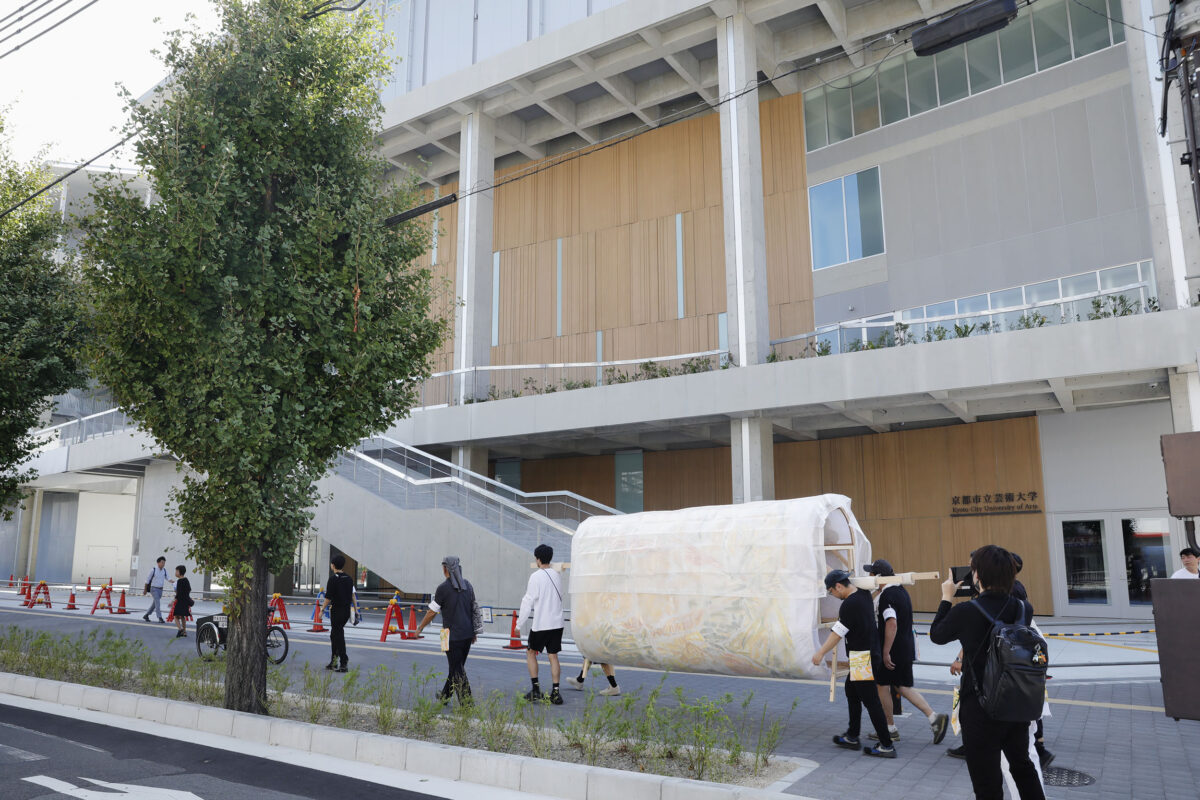 2023年9月25日(月)、旧@KCUAから新キャンパスまでの「引越し」の日を迎えました。壁画を楕円柱型の土台に巻き付け、4人で担げるようにセッティングをしました。また、警察署からは道路使用の許可証をいただきました。