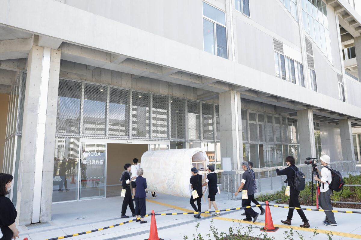 運ばれてきた壁画は、2023年10月1日(日)の式典の際にお披露目し、2023年10月3日(火)–11月12日(日)の会期で、「still moving final: うつしのまなざし 学長室壁画引越しプロジェクト(第2期)」として、@KCUA・芸術資料館共通エントランスにて展示を行いました。