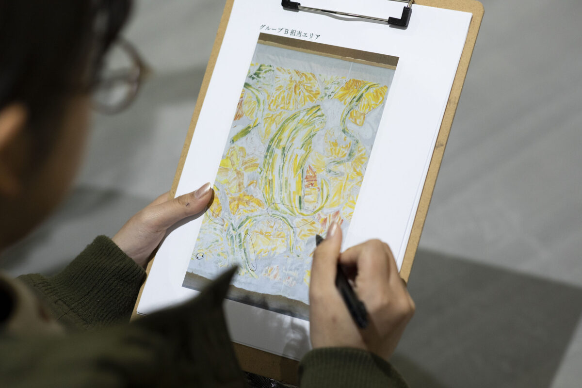 コンディション・チェックは、学芸の業務として非常に重要なものの一つでもあります。この沓掛キャンパス学長室壁画は、こうした技術を身近に学ぶことのできる作品としても機能する、大学の貴重な芸術資源となりました。