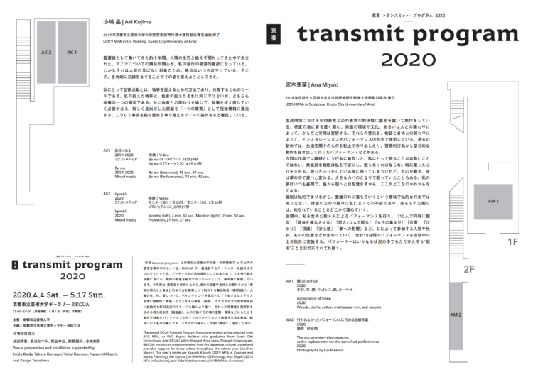 The annual KCUA Transmit Program features emerging artists selected from BFA, MFA, or PhD degree holders who graduated from Kyoto City University of Arts (KCUA) within the past three years. Through this program, @KCUA introduces artists emerging from the Japanese cultural capital and provides support for these artists throughout the school year (April to March).