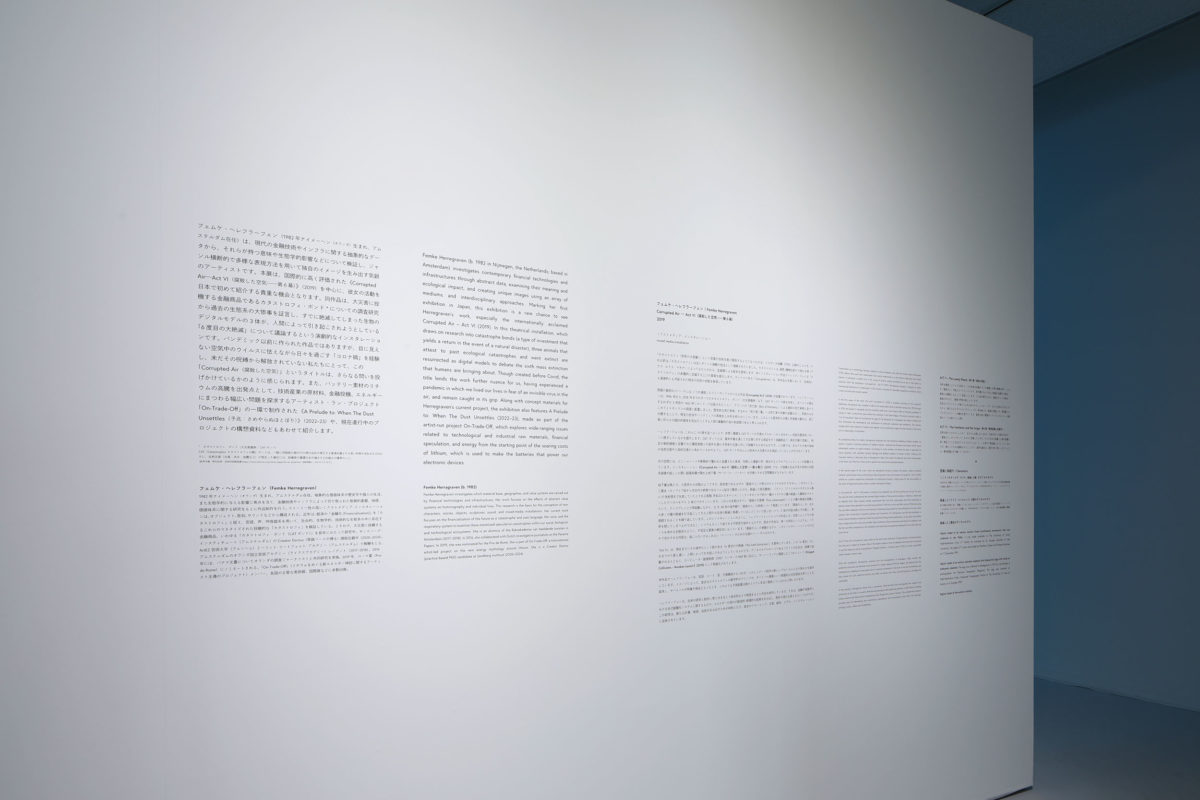 Femke Herregraven (b. 1982 in Nijmegen, the Netherlands; based in Amsterdam) investigates contemporary financial technologies and infrastructures through abstract data, examining their meaning and ecological impact, and creating unique images using an array of mediums and interdisciplinary approaches. Marking her first exhibition in Japan, this exhibition is a rare chance to see Herregraven’s work, especially the internationally acclaimed Corrupted Air – Act VI (2019). In this theatrical installation, which draws on research into catastrophe bonds (a type of investment that yields a return in the event of a natural disaster), three animals that attest to past ecological catastrophes and went extinct are resurrected as digital models to debate the sixth mass extinction that humans are bringing about. Though created before Covid, the title lends the work further nuance for us, having experienced a pandemic in which we lived our lives in fear of an invisible virus in the air, and remain caught in its grip. Along with concept materials for Herregraven’s current project, the exhibition also features A Prelude to: When The Dust Unsettles (2022–23), made as part of the artist-run project On-Trade-Off, which explores wide-ranging issues related to technological and industrial raw materials, financial speculation, and energy from the starting point of the soaring costs of lithium, which is used to make the batteries that power our electronic devices.