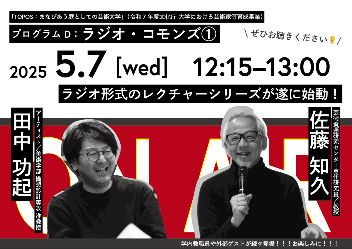 そこで「TOPOS:まなびあう庭としての芸術大学」プロジェクトのプログラムとして、ラジオの番組の形式をとったオンライン・レクチャー「ラジオ・コモンズ」を始動します!!