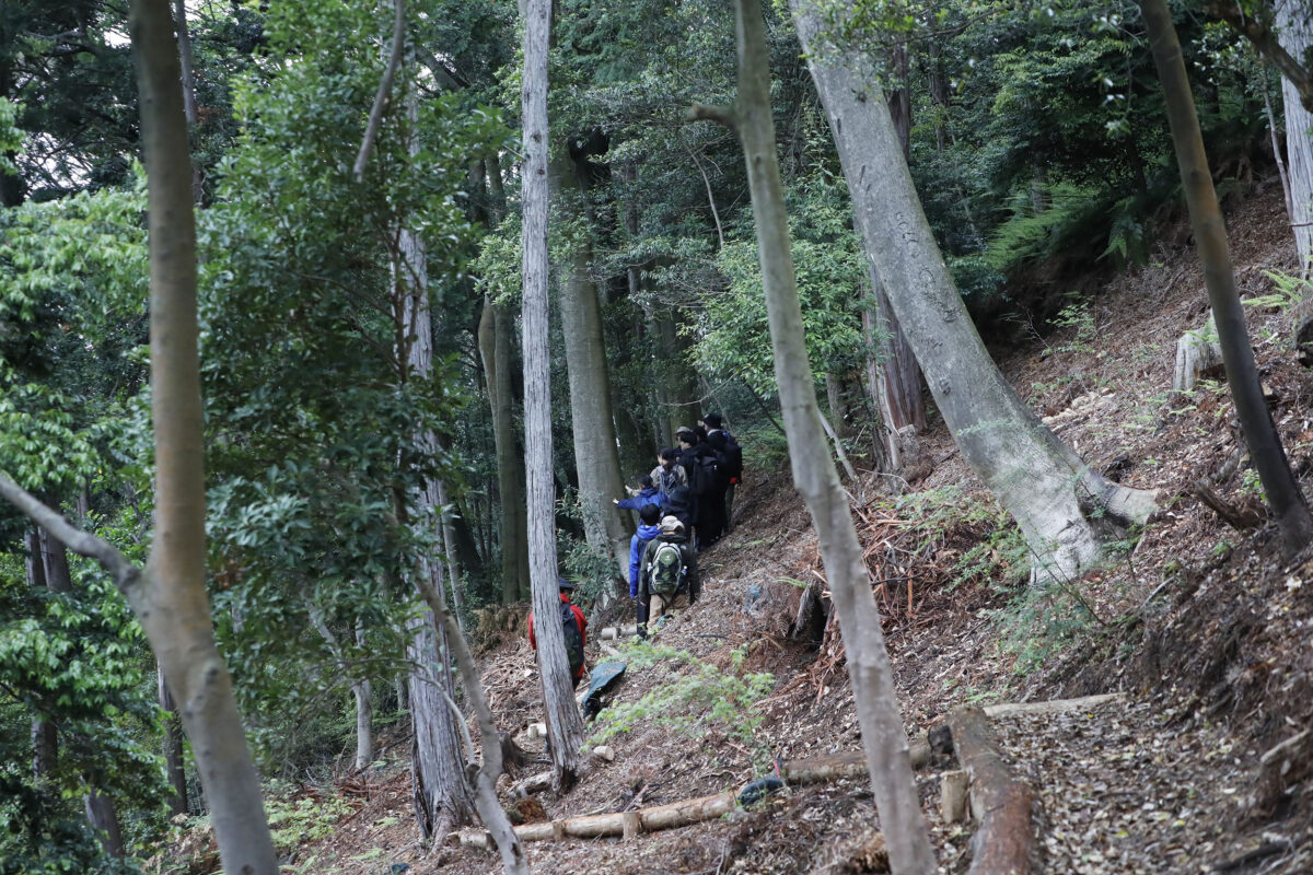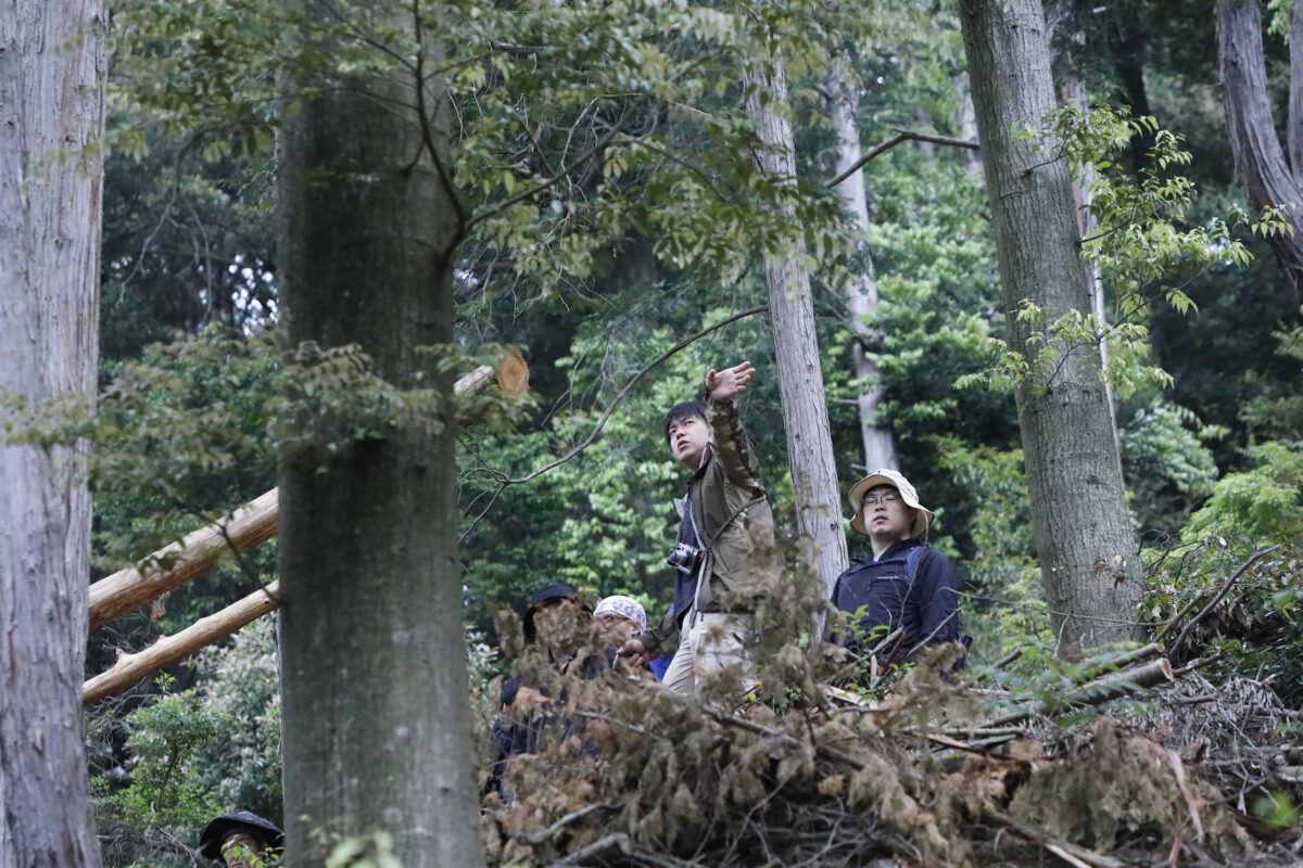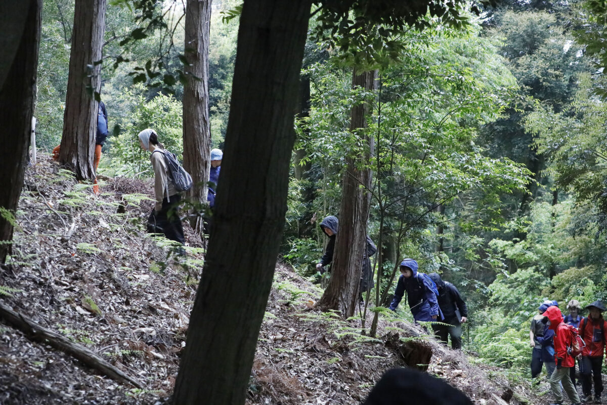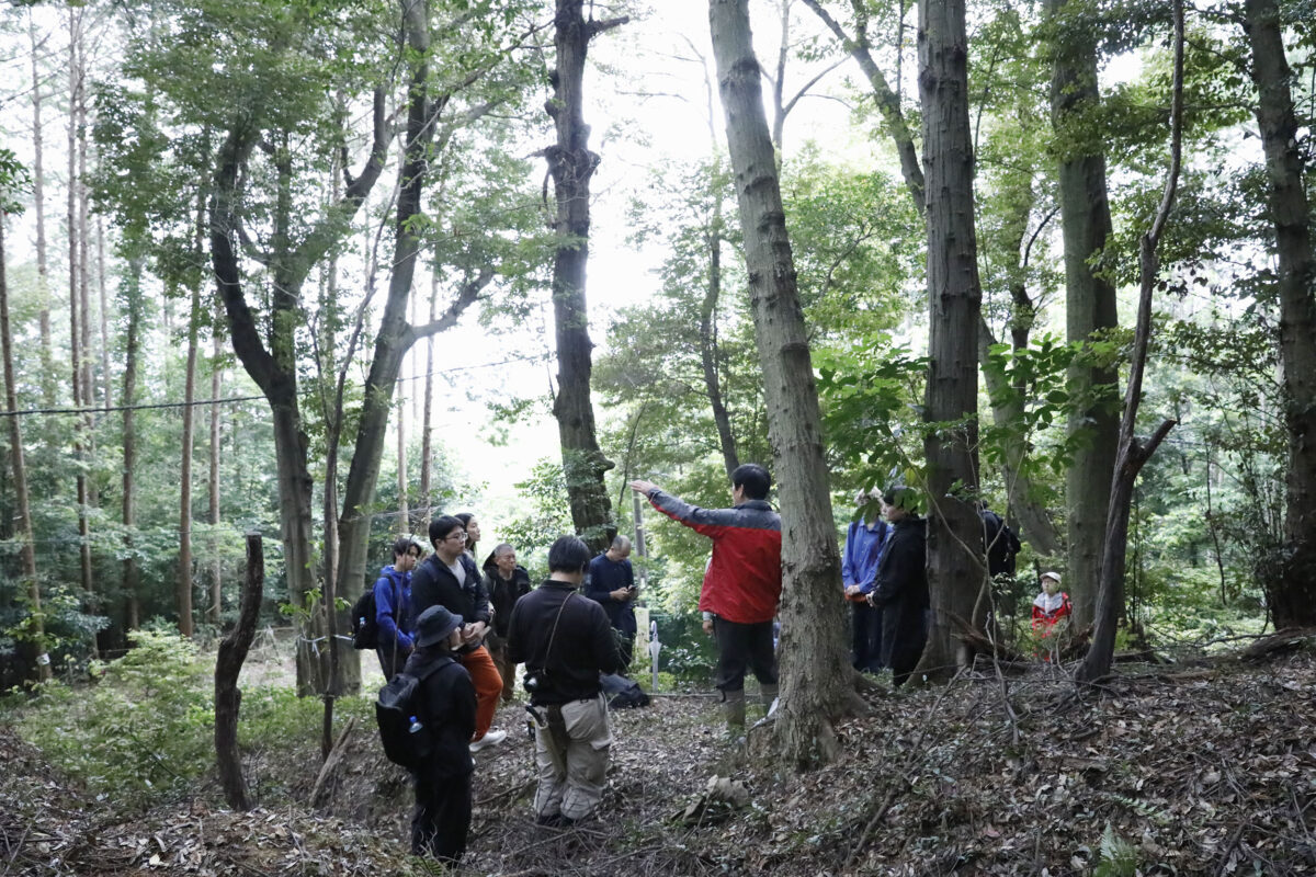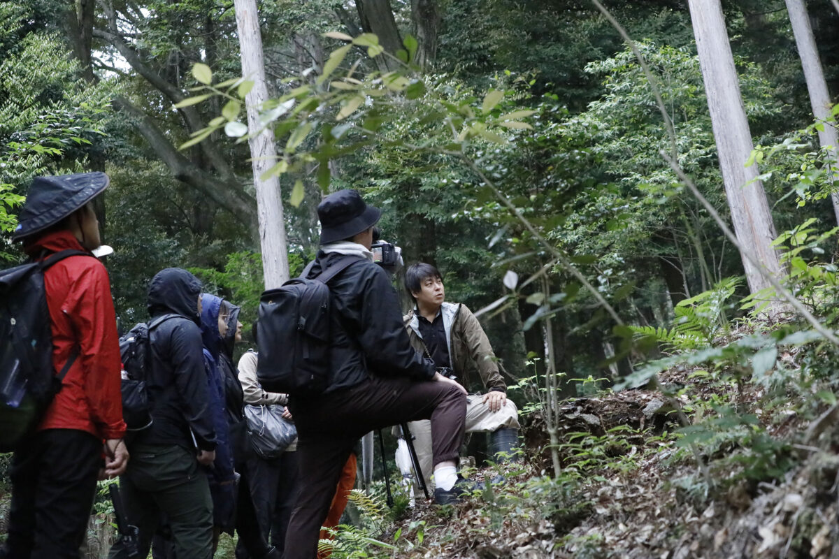東山地域の山の中で時折立ち止まり、講師たちの山づくりに関するお話に耳を傾けました。その場所に存在するさまざまな境界について、歩いたり、感じたりしながら体感できるフィールドワークとなりました。