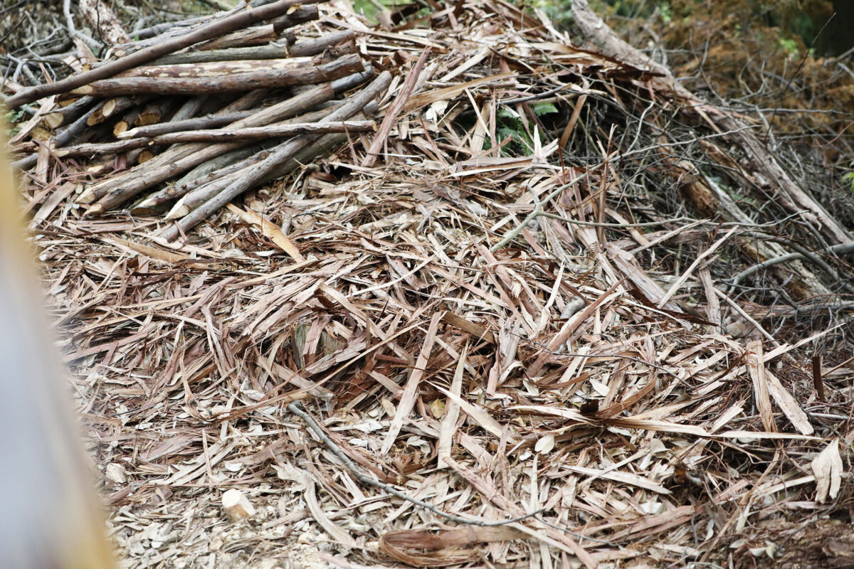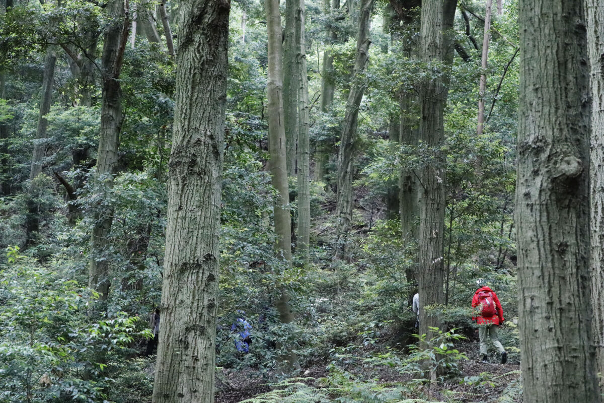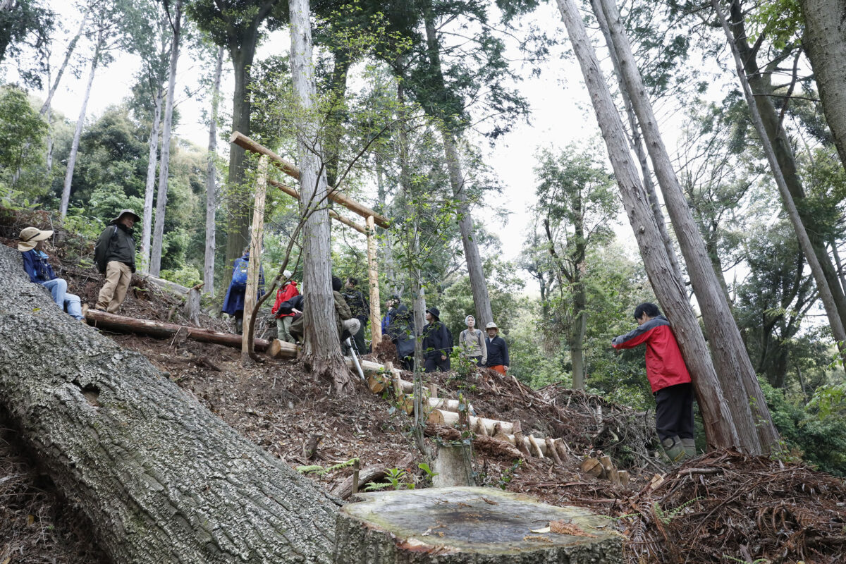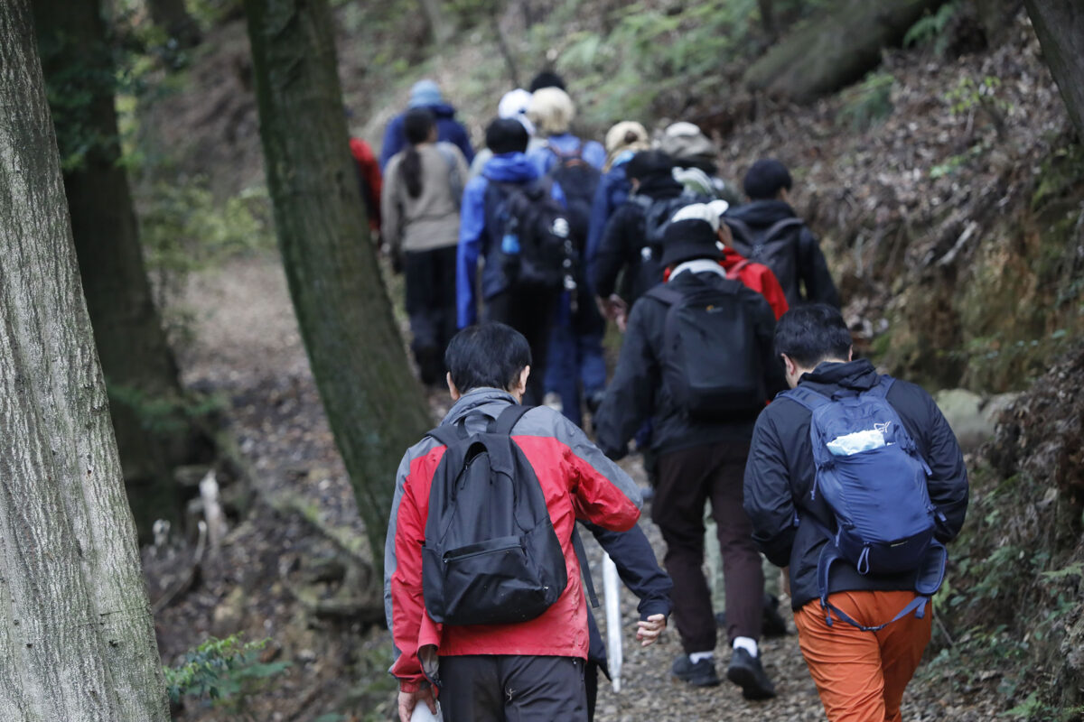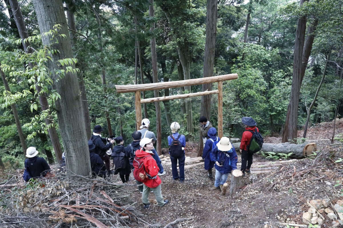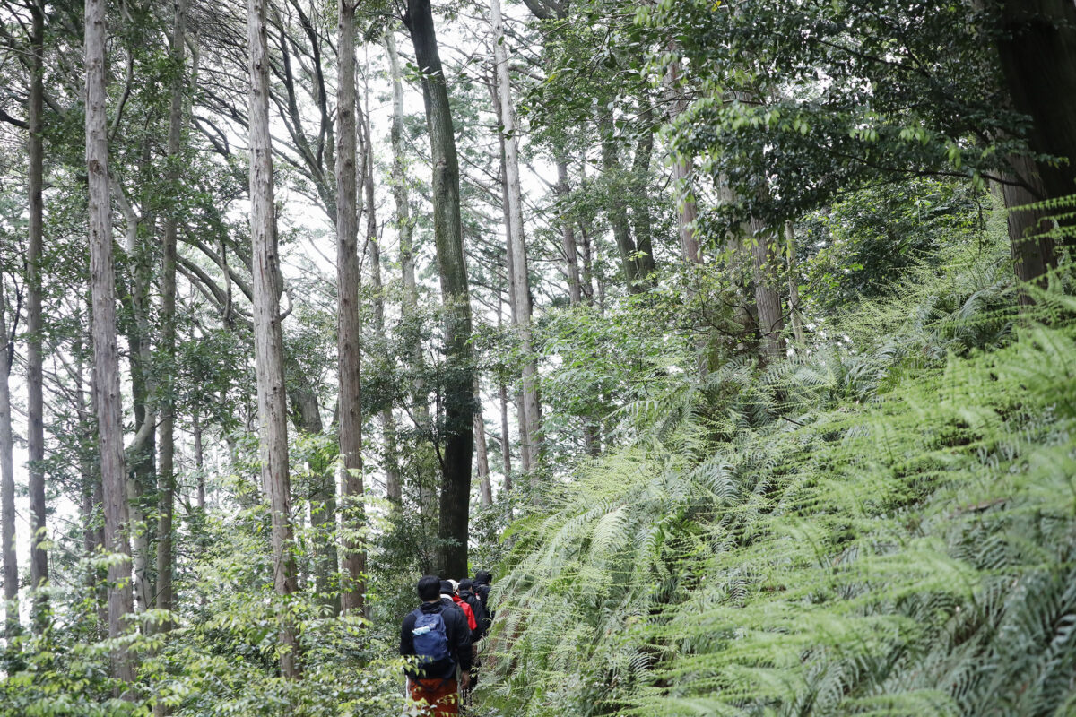 東山地域の山の中で時折立ち止まり、講師たちの山づくりに関するお話に耳を傾けました。その場所に存在するさまざまな境界について、歩いたり、感じたりしながら体感できるフィールドワークとなりました。