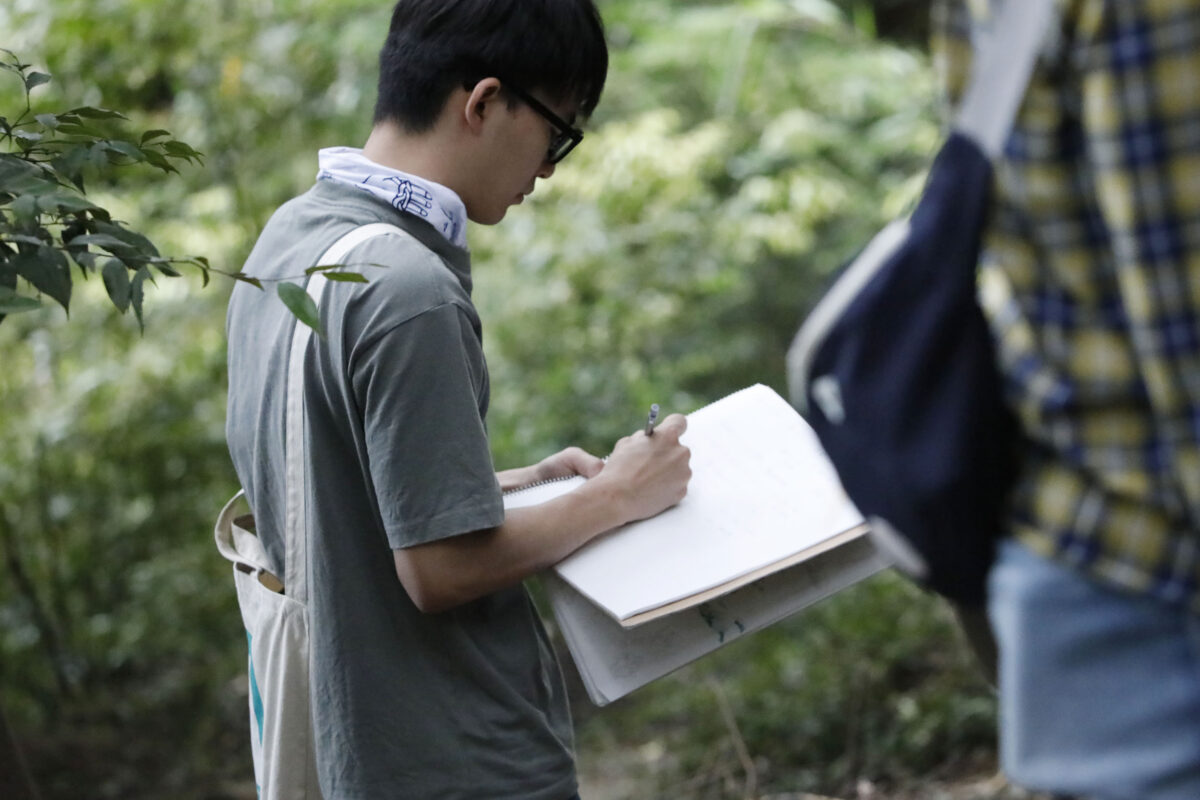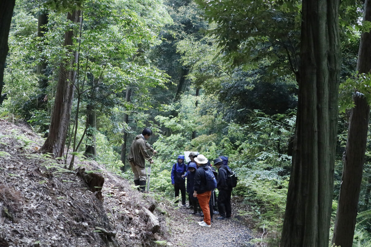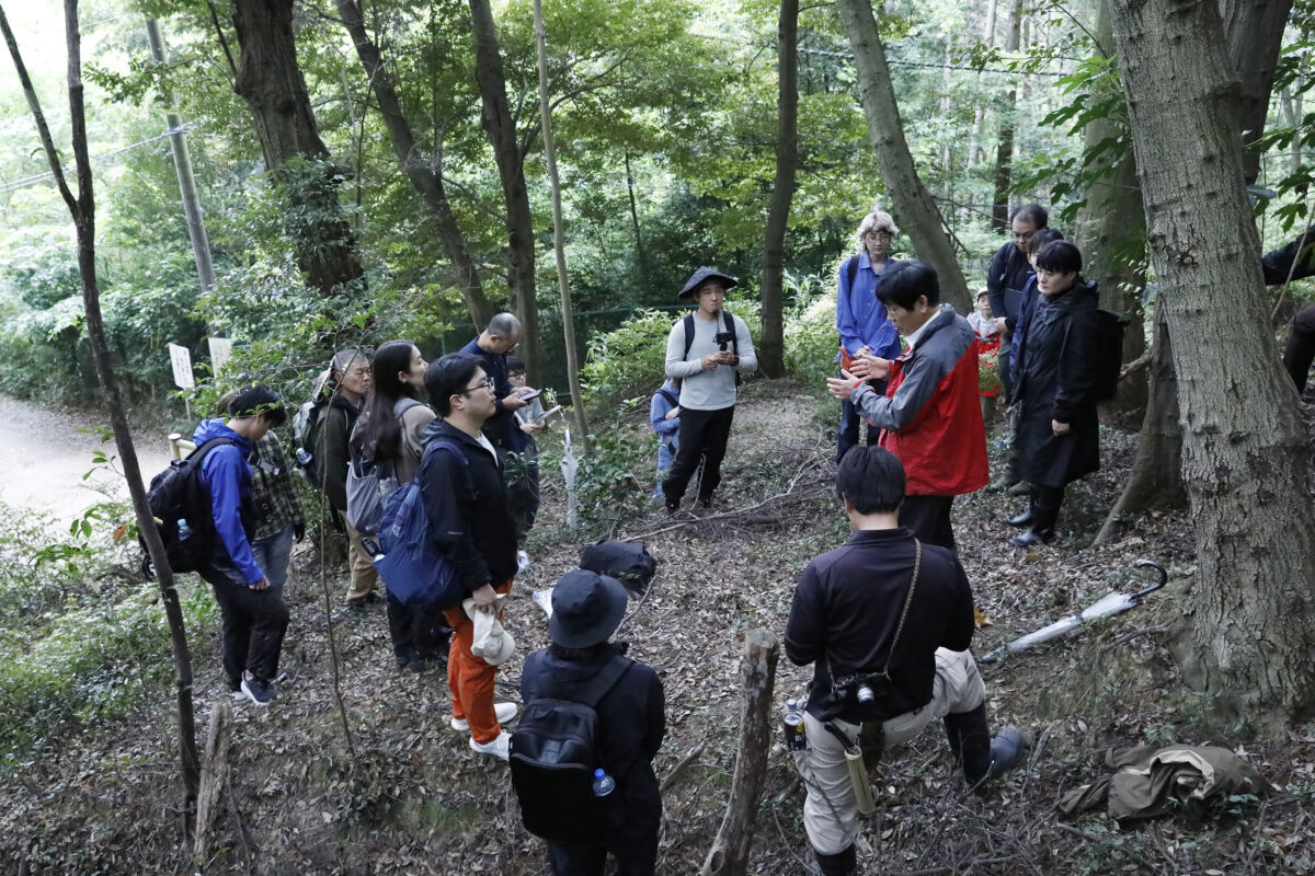 東山地域の山の中で時折立ち止まり、講師たちの山づくりに関するお話に耳を傾けました。その場所に存在するさまざまな境界について、歩いたり、感じたりしながら体感できるフィールドワークとなりました。