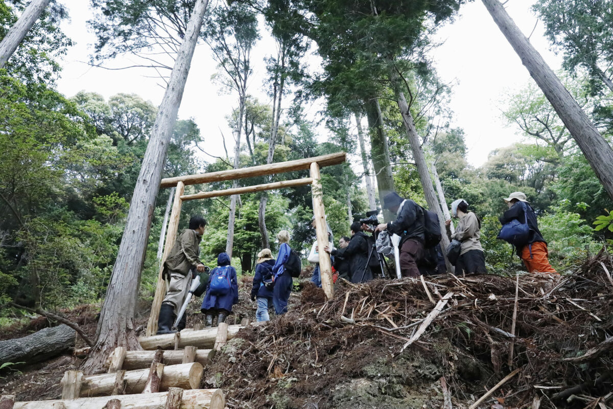 今回山道を作った場所は5年前からコジイやヒノキ劣勢木を伐採し出しました。ゴミの集積場所は上記の様な工夫をしながら決定してきました。この集積されたゴミが今回山道を作ると決まった時に、問題になるだろうと予測されてました。道を通す為にゴミを移動させる仕事が大変だと思っていたのですが、予測は外れ、ほとんどゴミを移動させる事無く今回の道づくりを終えました。なぜなのか。色々考えていたのですが、ゴミの置く場所を選定する時に、人目に付きにくい場所を選んでいること、神籬の様な一本で魅せられる様な立派な木の根元にはゴミを絶対ためないこと、などが関係していると思われます。そもそもゴミをためているような場所は元々魅力が薄いような場所を選んでいたのだと実感しました。鳥居を作った場所の横にゴミをためていたのは、元々一番きつい急斜面でウラジロというシダ類が強烈に繁茂している場所でヒトが立ち入れる様な環境では無かったことに起因しております。急斜面のウラジロの森を切り開き、そこに枝葉をためて、急斜面地に平場を作ること、さらにその枝葉をウラジロに覆いかぶせることによって枯らすことも目的の一つでした。森づくりにおいて、伐採した木を搬出しない場合、美しく魅せることに一番苦労しております。枝葉ゴミを置く場所について興味を持って頂いたこと。とても良い着眼点だと思います。(太田陽介)